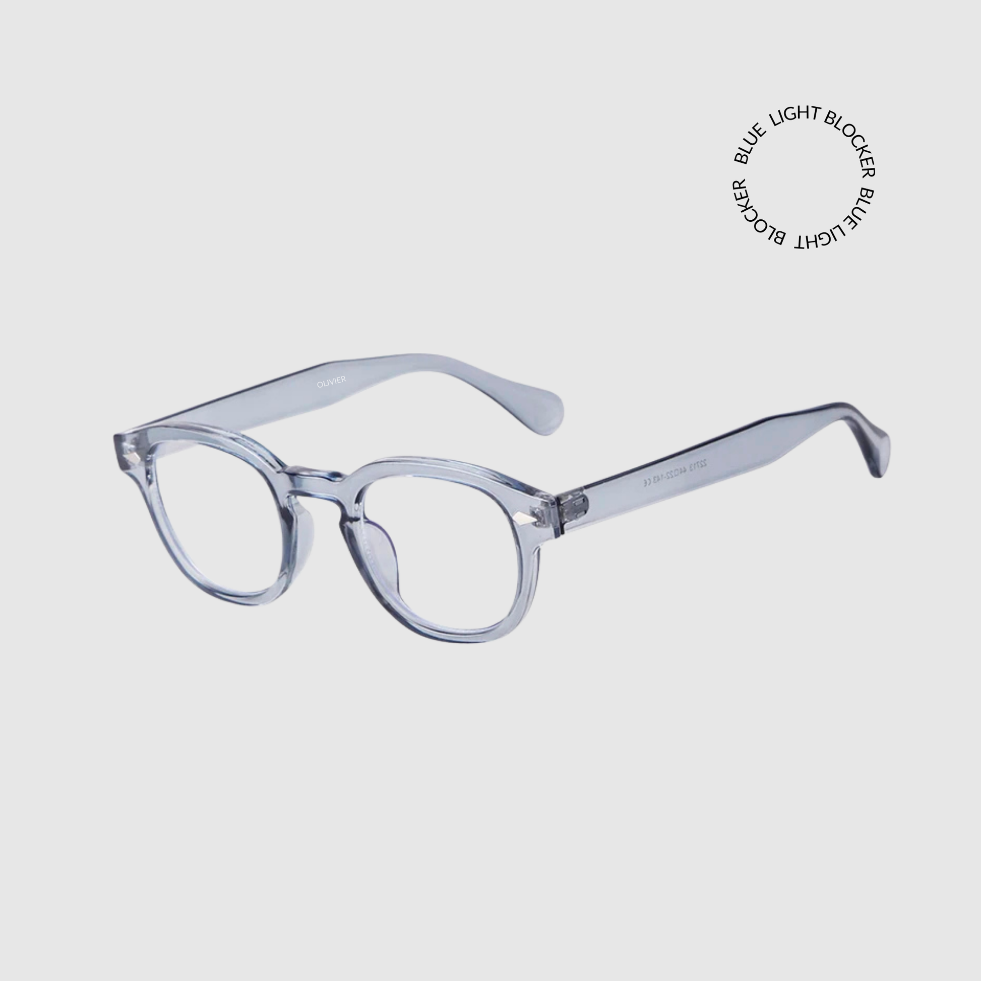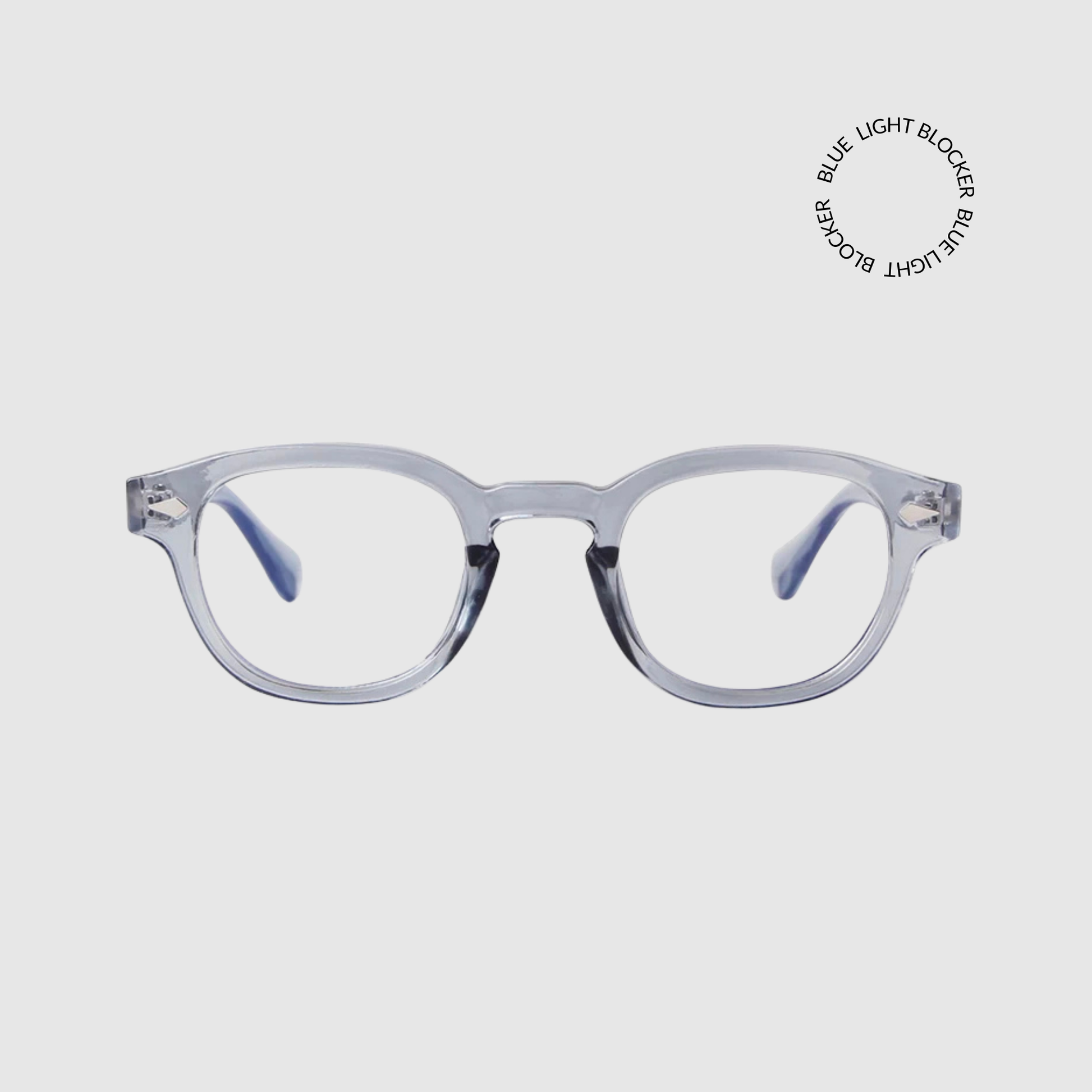 Meet BLU, your daily go to. Clear light blue/grey frames, clear blue light blocker lenses.